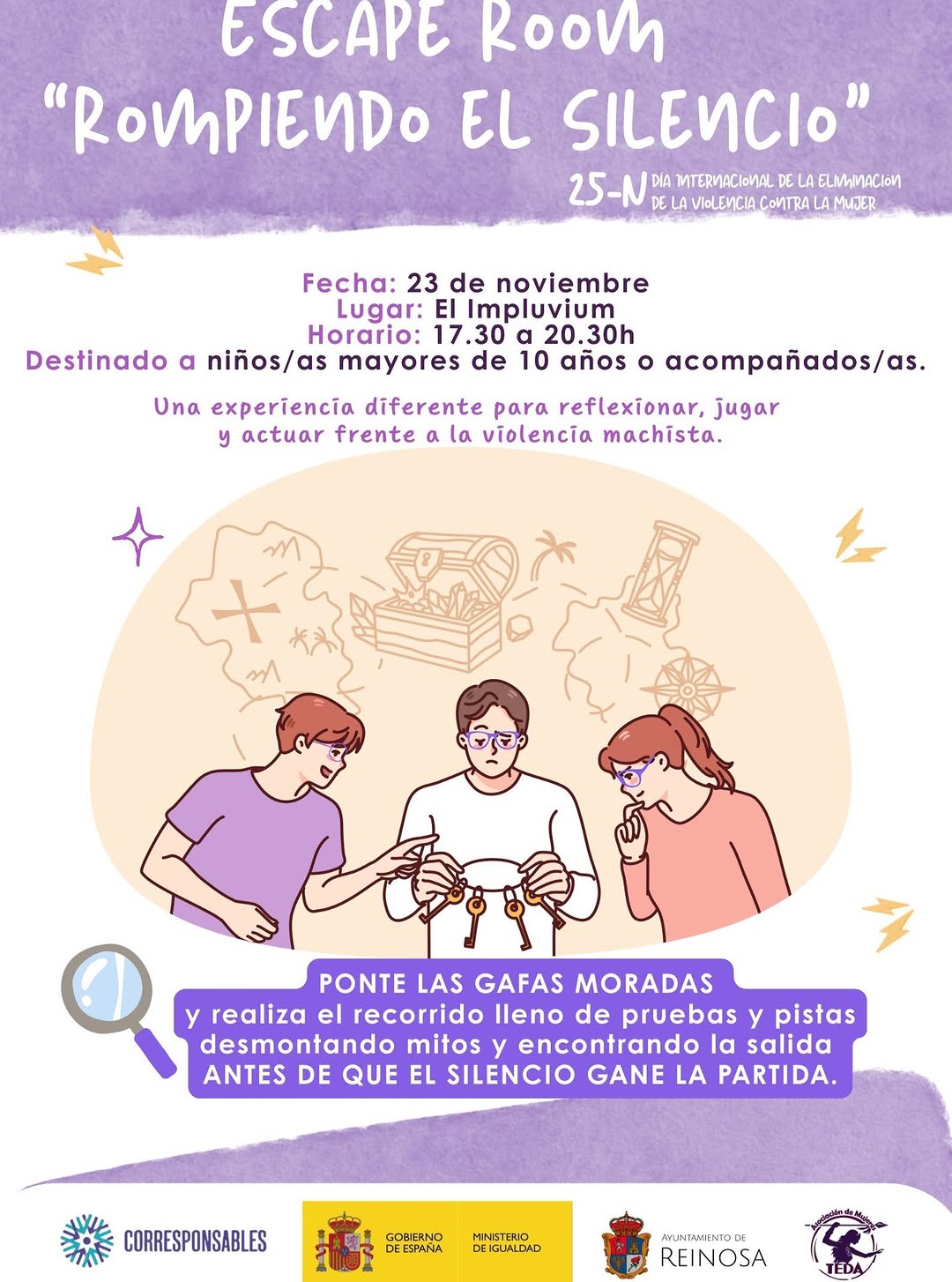 En el marco del 25-N Día Internacional de la Eliminación de la Violencia contra la Mujer. Destinado a niños/as mayores de 10 años o acompañados/as. Una experiencia diferente para reflexionar, jugar y actuar frente a la violencia machista. Ponte las gafas moradas y realiza el recorrido lleno de pruebas y pistas desmontando mitos y encontrando la salida antes de que el silencio gane la partida.
