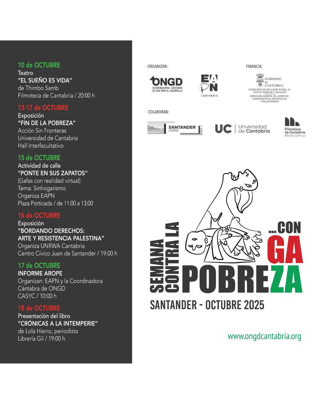Aquí presentamos el programa de actividades que hemos preparado con la colaboración de distintas organizaciones, entre ellas UNRWA Cantabria y Acción Sin Fronteras, con el propósito de visibilizar la pobreza y la exclusión social y promover una sociedad más justa, solidaria e inclusiva.